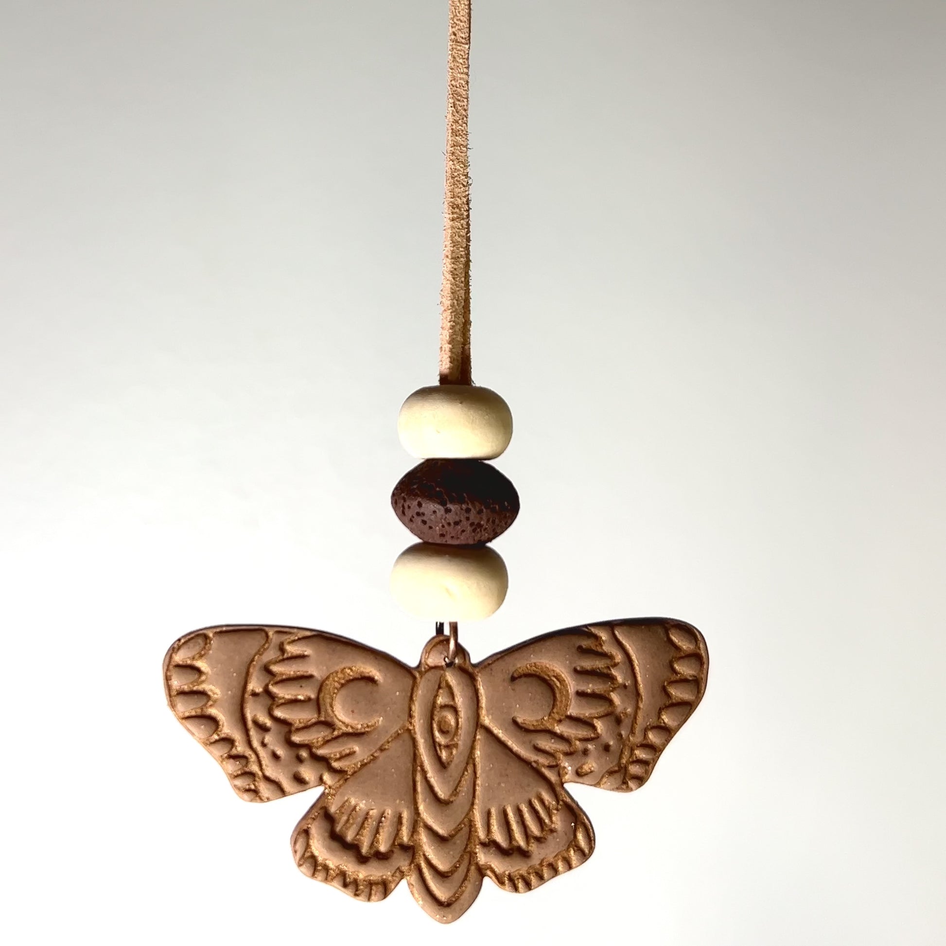 Made with lightweight polymer clay, natural lava rock bead, natural wooden beads and vegan suede cord.