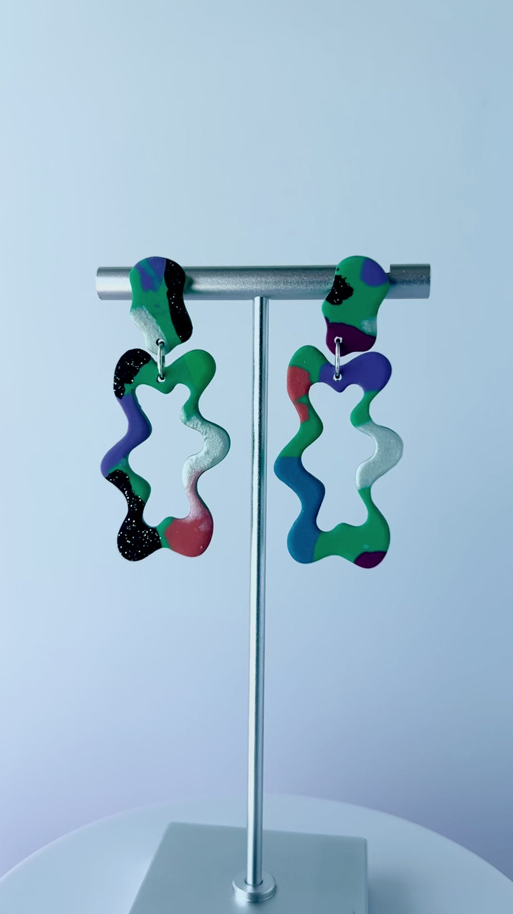 Get your squiggle on with these playful colorblock earrings that are bold, bendy, and bursting with personality. Each pair is handmade from lightweight polymer clay in vibrant shades of orange, pearl, burgundy, blue, yellow, and cosmic black with sparkles. The abstract wiggly silhouette is pure joy in earring form.