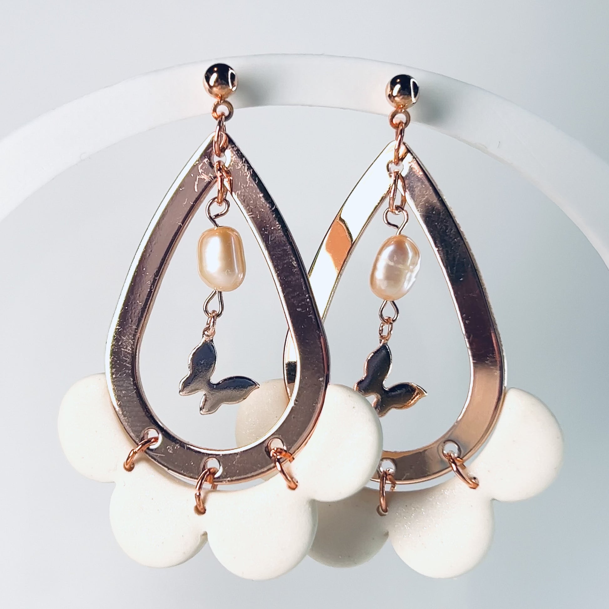 Dua - Floral Rose Gold Teardrop Earrings with Pearls & Butterflies