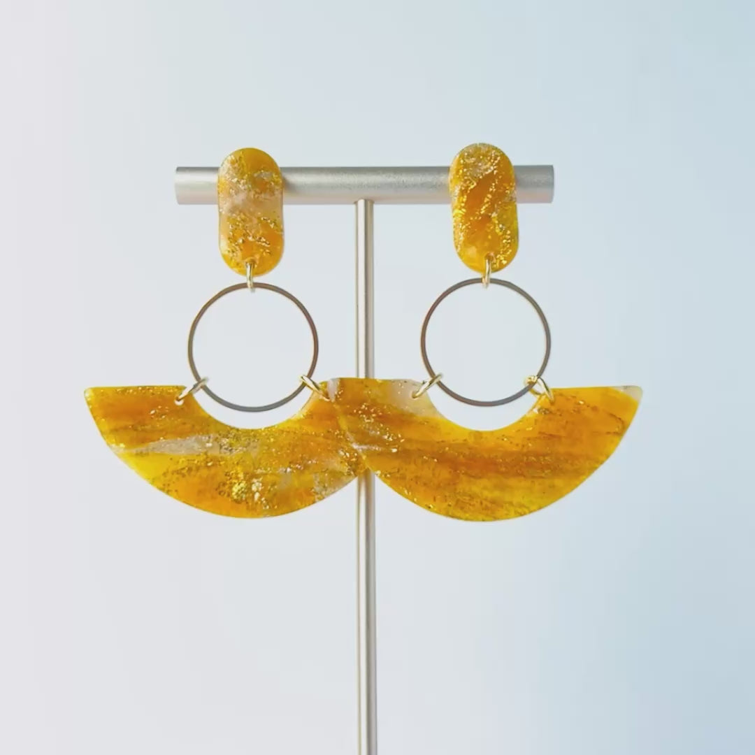 Sunshine meets statement style with these handmade polymer clay earrings from Emaloe’s Thingys. Featuring a golden marbled half-circle paired with a sleek gold stainless steel linking ring, these earrings bring the perfect blend of retro charm and modern minimalism. Embedded titanium posts make them safe for sensitive ears, while the ultra-lightweight design means you can shine comfortably all day long.