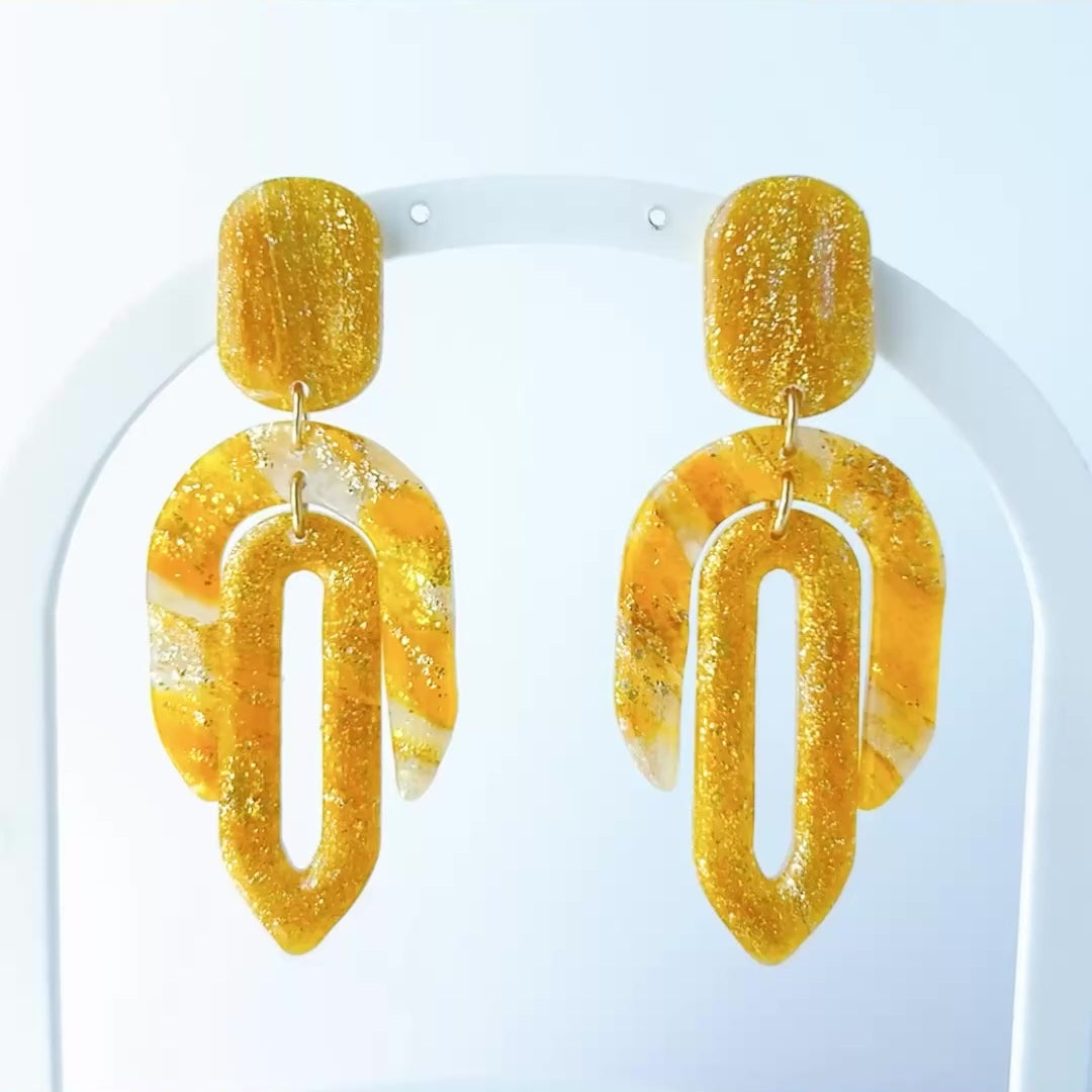 Bring the sunshine with you wherever you go. These dazzling golden yellow polymer clay earrings from Emaloe’s Thingys are handcrafted to turn heads. With embedded glitter and dreamy golden swirls, the lightweight design features embedded titanium posts—perfect for sensitive ears. The layered, geometric shape gives them a bold, modern feel while still keeping things lightweight and comfy.