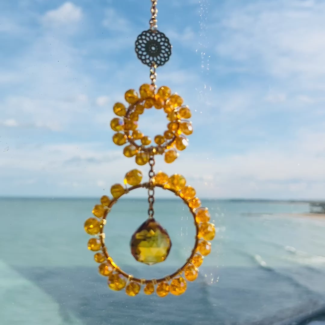This Orange AB Glass Suncatcher features two tiers of gold wire-wrapped hoops shimmering with brilliant aurora borealis (AB) coated orange glass beads. A faceted amber crystal prism swings at the center, catching and scattering light across your space like drops of golden honey.