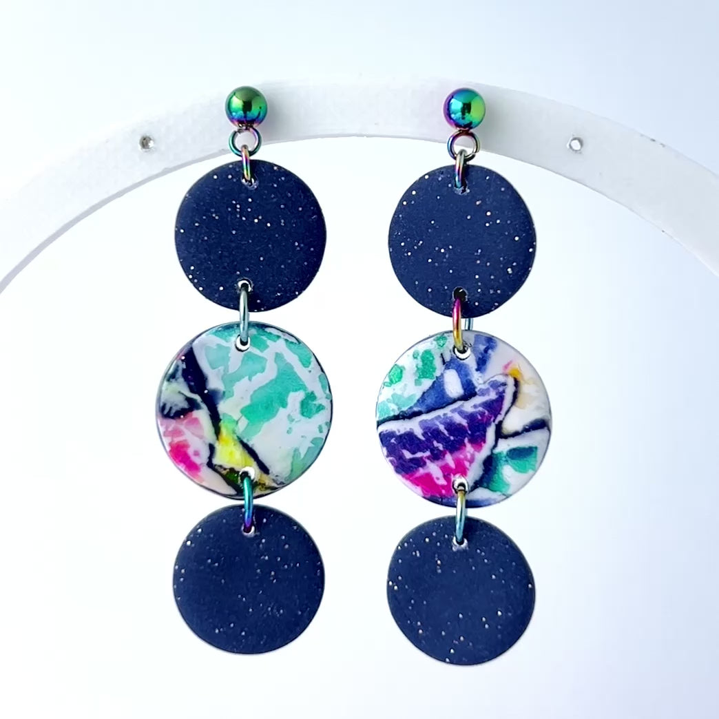 Looking for earrings that feel like a cosmic color party? Meet the Purple Galaxy Dot Drop Earrings! These handmade beauties feature three stacked polymer clay circles – two in a dreamy speckled purple and one in a colorful marbled design that pops like a rainbow in motion.
