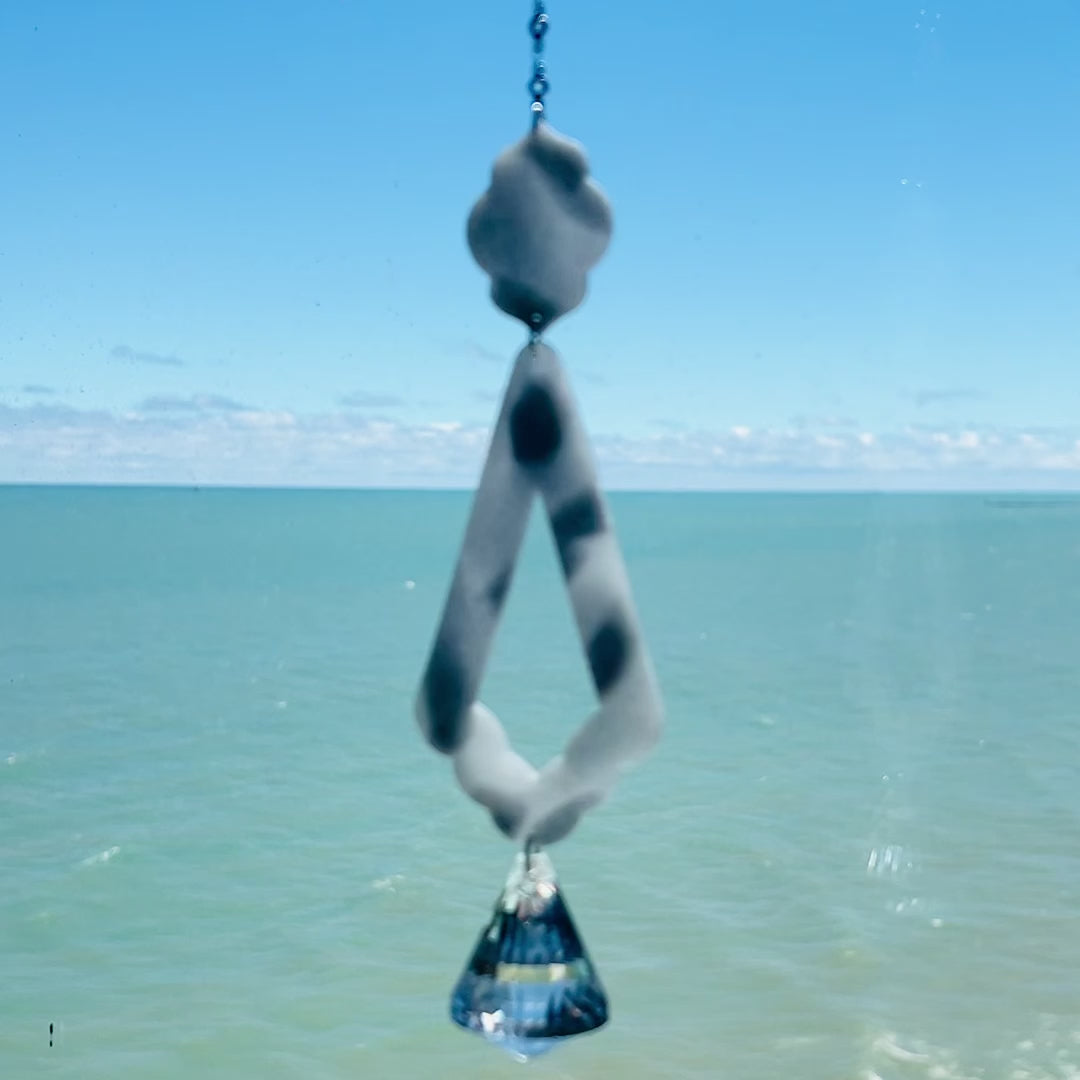 This suncatcher is handmade with semi-transparent polymer clay and features: