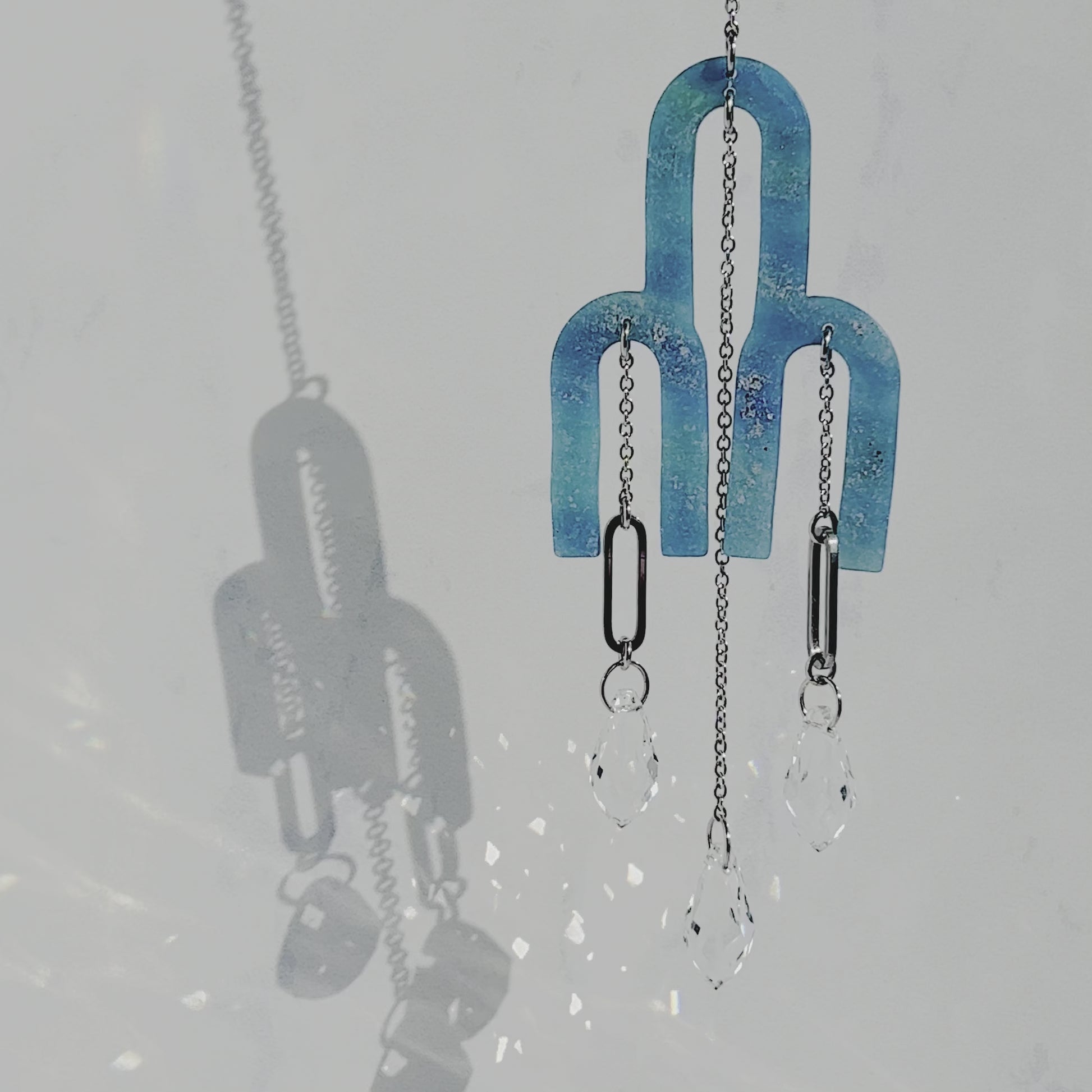 This suncatcher is handmade with semi-transparent polymer clay and features: